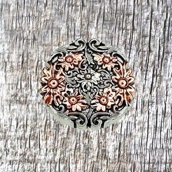 CON512-A-2/TONE Nickel and Copper 2/TONE finish 1" screw back concho with black enamel to accentuate the details of the floral pattern.