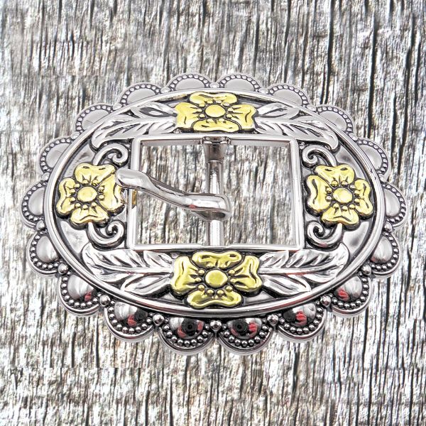 CON512-J-2/TONE Headstall hardware buckle with nickel, brass plating with black enamel wash finish headstall buckle fits 3/4" wide straps.