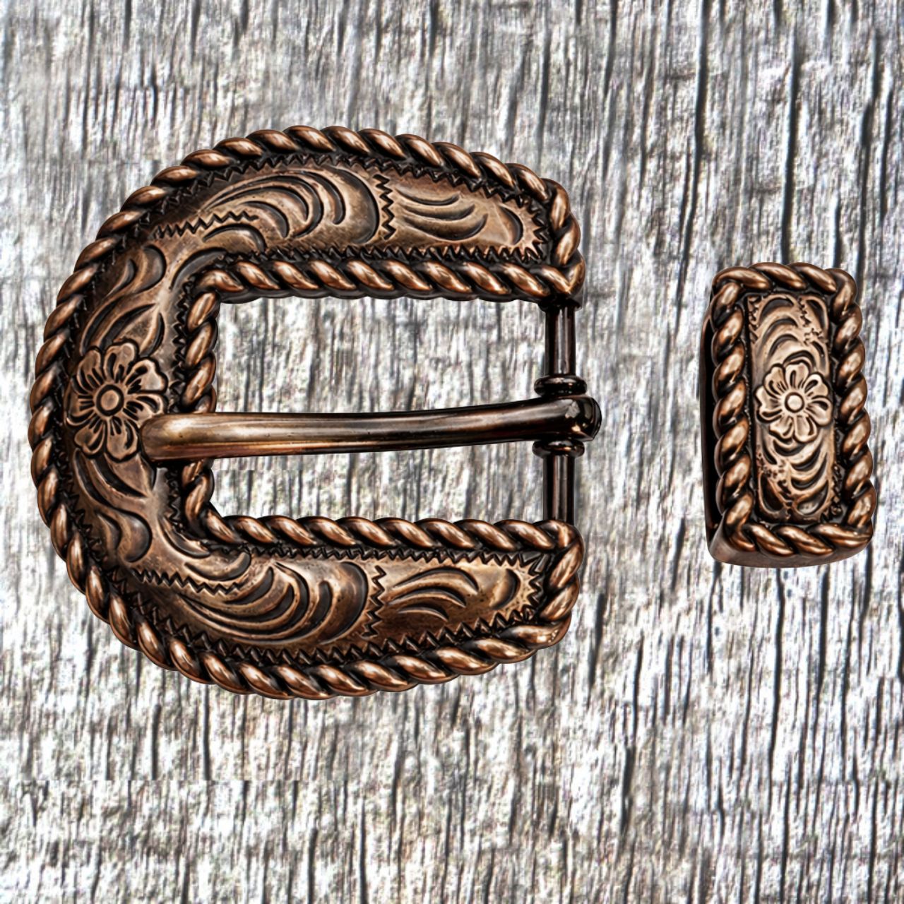 This buckle set features a traditional twisted rope border that frames the piece with depth and texture, creating a timeless Western silhouette. The antique copper finish presents a warm, brown‑copper tone with a subtle metallic sheen, enhancing the rope trim without excessive brightness. The matching keeper mirrors the buckle’s design, ensuring a cohesive and balanced appearance across the entire strap.