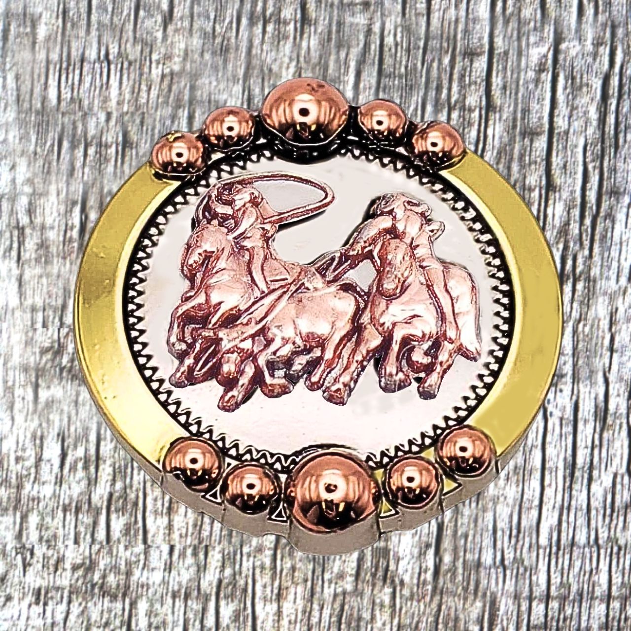 This Team Roper Rodeo Concho delivers a bold, traditional Western look with a clean, high‑contrast NBC (Nickel, brass and copper) finish that highlights every engraved detail. Designed for makers who want a concho that instantly communicates action, heritage, and craftsmanship, it features a dynamic team‑roping motif framed by crisp scrollwork and a polished outer edge. The 1‑3/8" profile provides strong visual presence without overwhelming the leatherwork, making it ideal for belts, tack, breast collars, bags, and custom Western accessories.